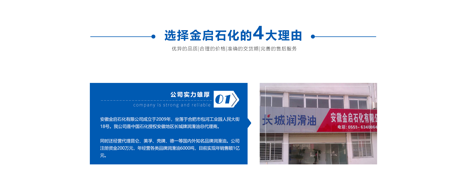 安徽金啟石化有限公司成立于2009年,坐落于合肥市包河工業園人民大街18號。我公司是中國石化授權安徽地區長城牌潤滑油總代理商。同時還經營代理昆侖、美孚、殼牌、德一等國內外品牌潤滑油。公司注冊資金200萬元,員工包括技術服務、業務人員25人,公司有完備的倉儲設施、良好的售前售后服務以及方便快捷的配送能力。年經營各類品牌潤滑油6000噸,目前實現年銷售額1億元。 公司以中國石化背景為依托,憑借好的產品和良好的服務,經過不斷的努力,贏得無數客戶的信賴和贊頌。經營產品包括工業設備用油、裝機用油、車用潤滑油、潤滑脂以及金屬加工油、防銹油劑、特種潤滑劑及表面處理劑、清洗劑等,服務于汽車、電力、工程...